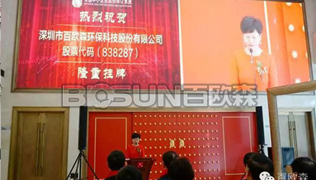 深圳市百歐森環保科技股份有限公司掛牌上市,成功登陸資本市場,具有里程碑式意義,在新的市場形勢下,為企業規模化、高標準經營開辟了一條新路,勢必將進一步提升企業品牌影響力,帶來更加廣闊的發展空間,為環保事業做出更大的貢獻!讓我們共同期待,上市之后的百歐森即將帶給我們的傳奇精彩。