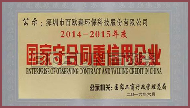 榮譽是對過去的肯定,而奮斗與發(fā)展才是永恒的主題。百歐森將繼續(xù)突破創(chuàng)新、卓越前行。不忘初心,為環(huán)保事業(yè),奉獻力量,守護拼搏!“守合同、重信用”已成為企業(yè)在市場競爭中不可或缺的重要品質(zhì)之一,是企業(yè)生存發(fā)展之本、開拓創(chuàng)新之基。